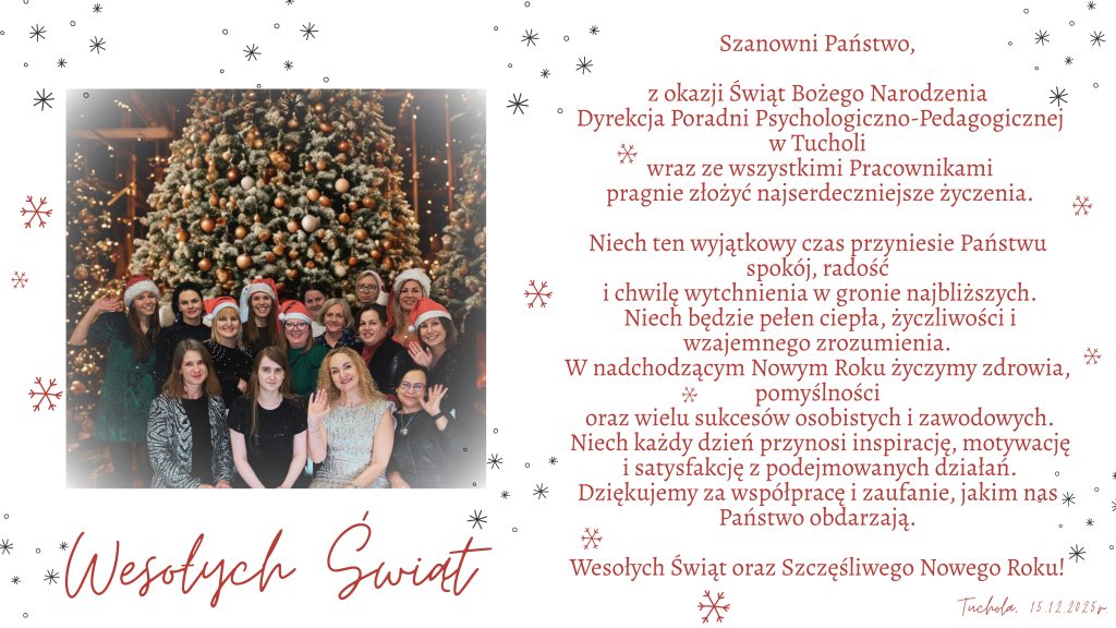 Życzenia Świąteczne Post published:19 grudnia 2025 Może ci się spodobać również 🎉 Gratulacje dla naszej psycholożki – mgr Eweliny Pociot-Gostomskiej! 🎉 4 czerwca 2025 Spotkania dla specjalistów w ramach sieci wsparcia 7 listopada 2023 Poradnia dla Autyzmu – wykład z okazji Dnia Świadomości Autyzmu 12 lutego 2020